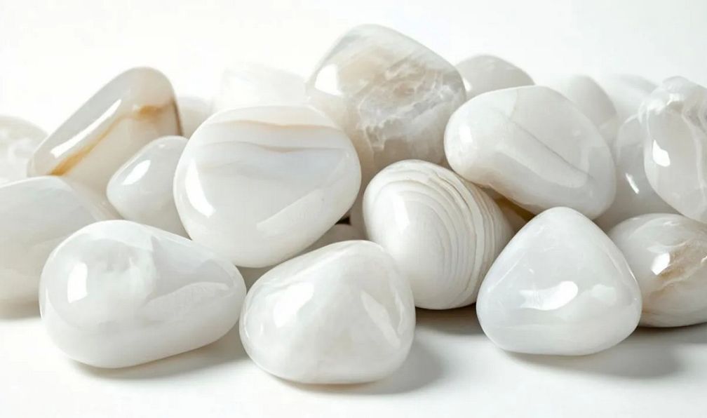 Белый агат — это полосчатая форма халцедонового кварца. Он имеет изогнутые полосы белого, серого, а иногда и бледно-голубого цвета. Полосы состоят из микроскопических кристаллов кварца. Твердость агата составляет от 6,5 до 7 по шкале Мооса.