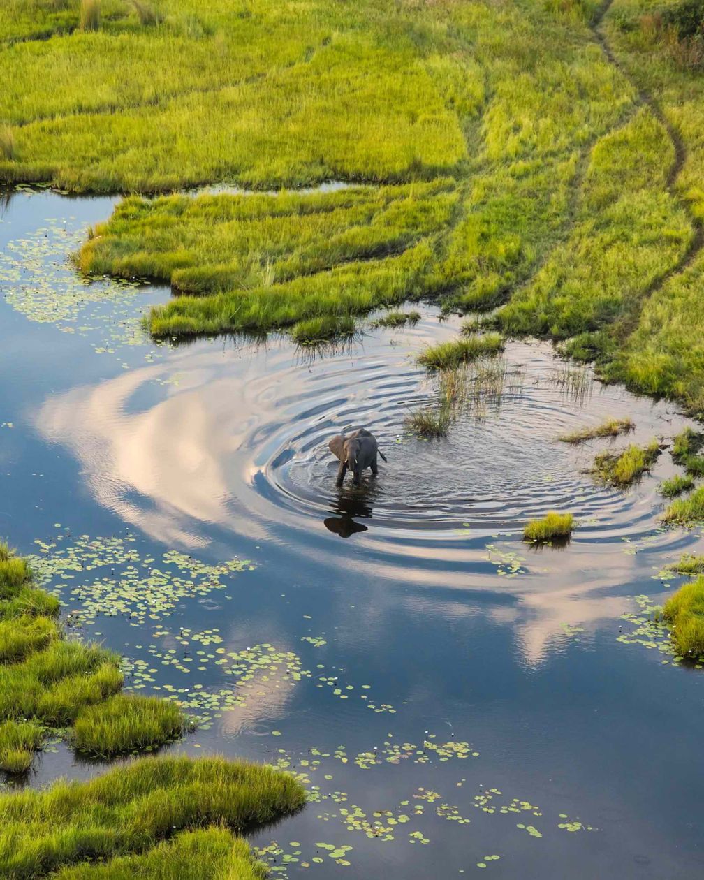 Вид на слона с высоты птичьего полета, дельта Окаванго, Ботсвана, Африка: