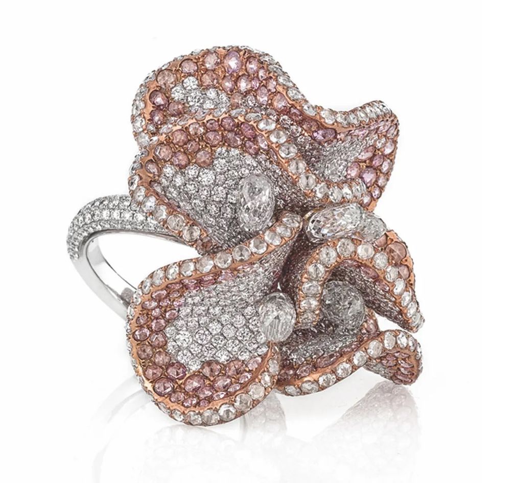 Еще одно розовое кольцо с уникальным использованием природных бриллиантов – потрясающее кольцо Pink Magnolia от Neha Dani. Пять бриллиантов двигаются при прикосновении и создают мягкое сияние. Лепестки созданы из 197 розовых бриллиантов огранки роза, 186 белых бриллиантов огранки роза и 1 498 круглых бриллиантов. Все они закреплены в оправе из 18-каратного белого и розового золота.