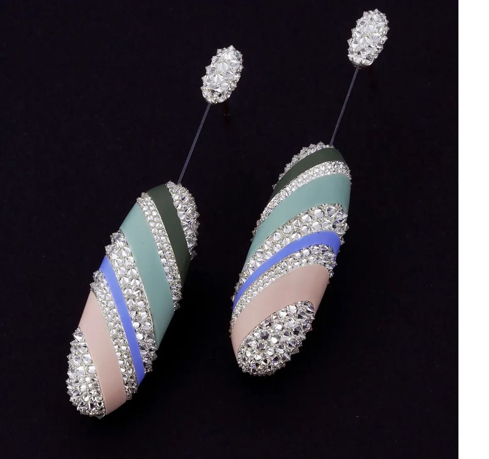 Еще одно необыкновенное украшение и мечта любителя пастельных тонов – пара сережек с природными бриллиантами, окаймленными керамикой нежных тонов, в оправе из серебра и 18-каратного розового золота.