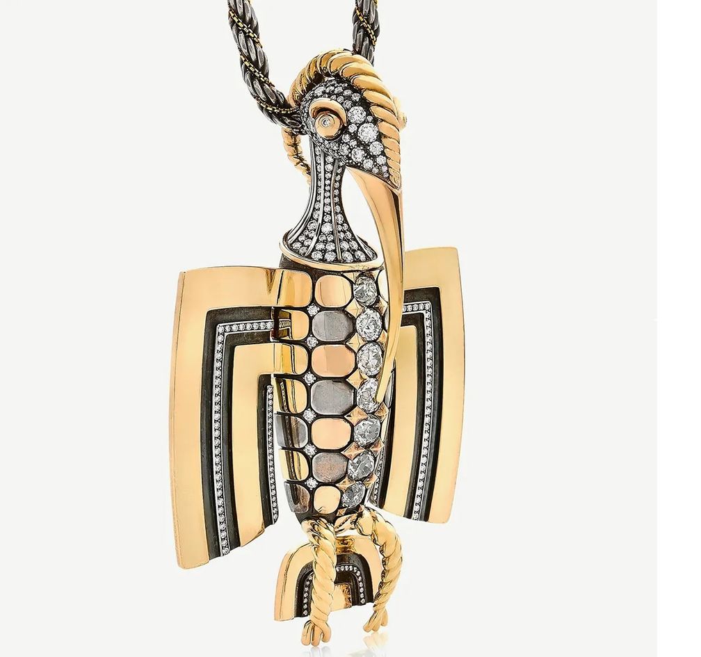 Посетителей выставки поразила великолепная подвеска Diamond Caolo. Подвеска входит в коллекцию Magica Naturae Bestiaire. Антикварные природные бриллианты превращаются в волшебное существо с помощью желтого золота, серебра с эффектом старины и розового золота.