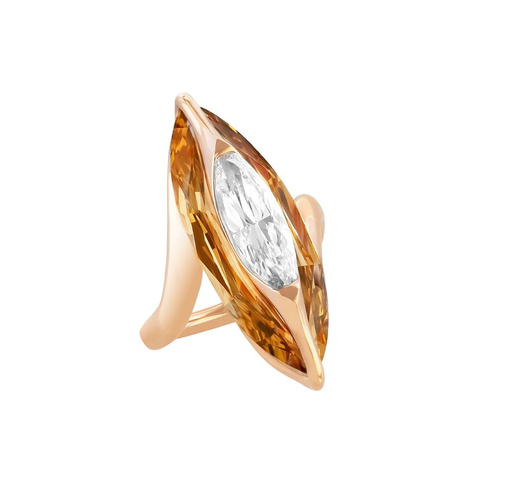 Два необычных бриллианта соединены между собой техникой «kissing» и оправлены в 18-каратное розовое золото. Центральный бриллиант имеет форму Moval. Moval – это название необычного бриллианта, сочетающего в себе овальную форму и огранку маркиз. Бриллиант формы Moval расположен над бриллиантом фантазийного глубокого коричневато-оранжево-желтого цвета огранки маркиз.