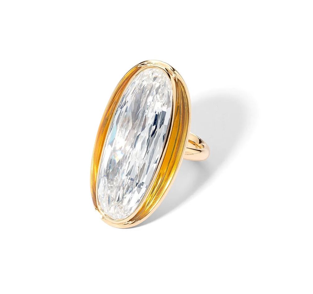 Этому исключительному кольцу присуща естественная притягательность благодаря крупному бриллианту овальной формы, весом 16,45 карата, старой шахтной огранки и янтаря весом 1 карат. Внушительный центральный камень и янтарь украшены 77 бриллиантами и почти 20 граммами 18-каратного желтого золота.
