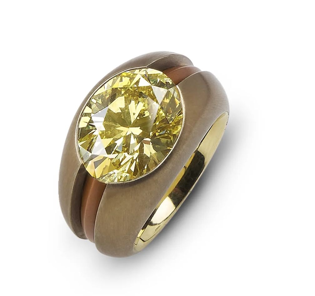 Теплый цвет этого потрясающего кольца Hemmerle с темно-коричневато-желтым бриллиантом весом более 15 карат в центре дополнен бронзой и белым золотом.