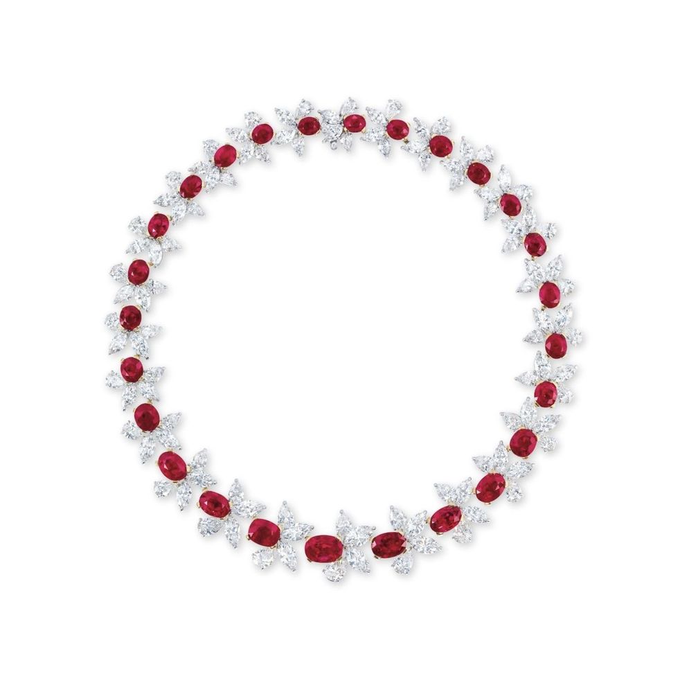 Колье Red Scarlet, состоящее из двадцати шести градуированных рубинов овальной формы весом от 5,38 до 1,27 карата, акцентировано россыпью бриллиантов грушевидной огранки и огранки маркиз.