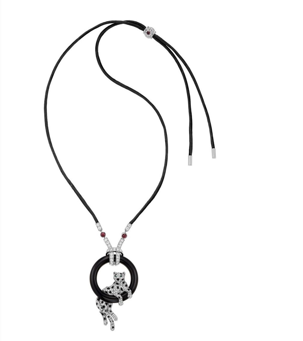 Колье-подвеска Panthere de Cartier с бриллиантами и драгоценными камнями, выпущенное Cartier в 2007 году, было сделано в виде лежащей пантеры и украшено круглыми бриллиантами, рубинами, изумрудами и ониксом.