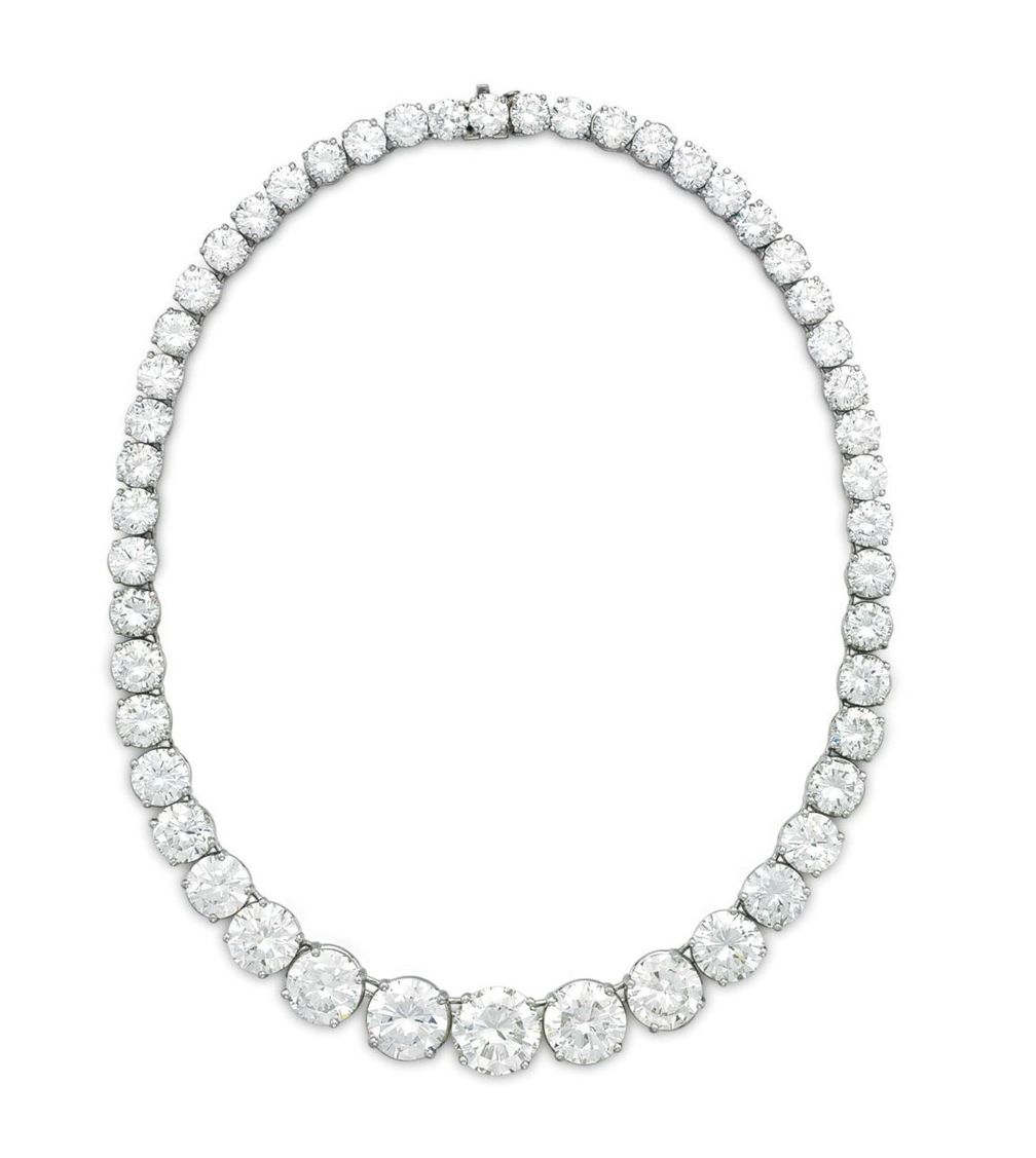 Бриллиантовое колье Rivière, выставленное на аукционе Christie’s, представляет собой непрерывную линию бриллиантов, которые закреплены по отдельности и соединены в один ряд.