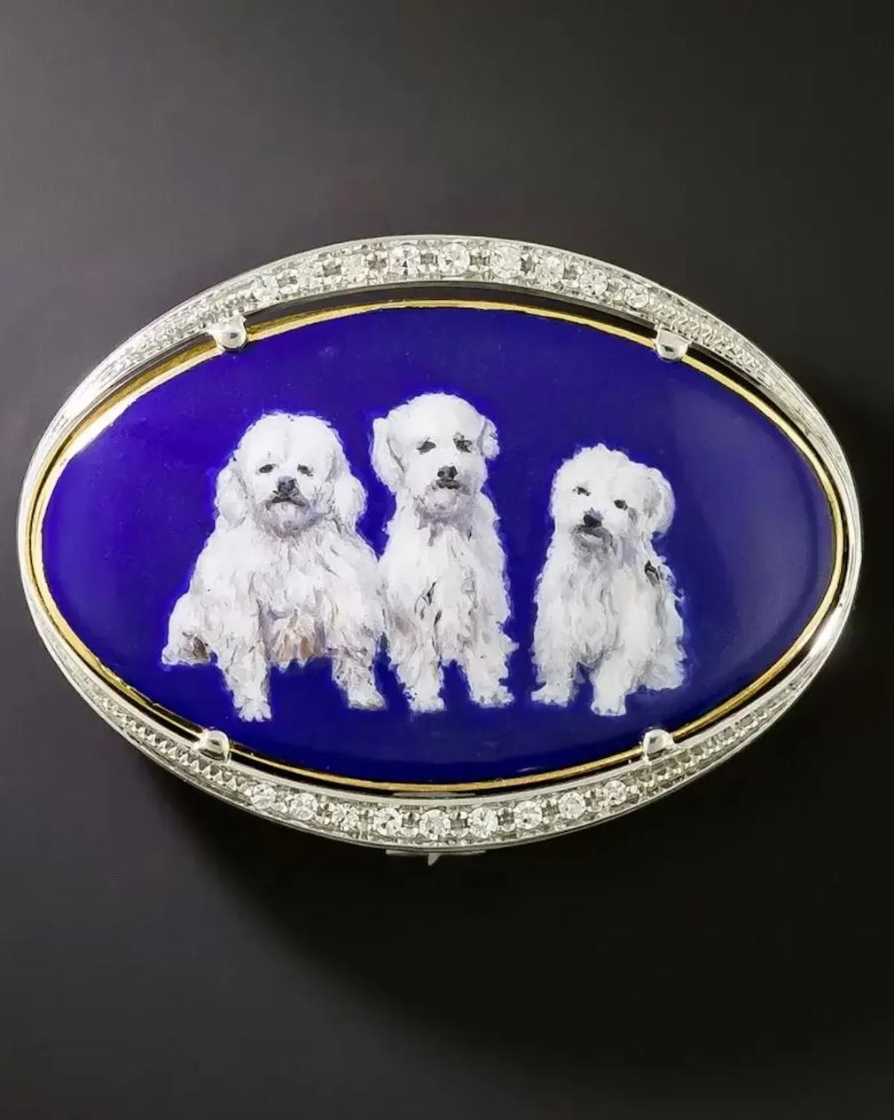 Эта брошь из природных бриллиантов и эмали с ручной росписью от Lang Antiques покорит сердца всех любителей животных. Поместите эту брошь на свою любимую сумку.
