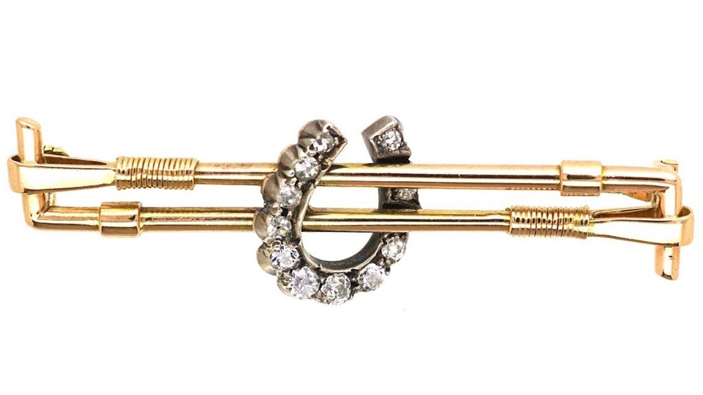 Эдвардианская брошь в виде подковы и хлыста из 15-каратного золота с бриллиантами: