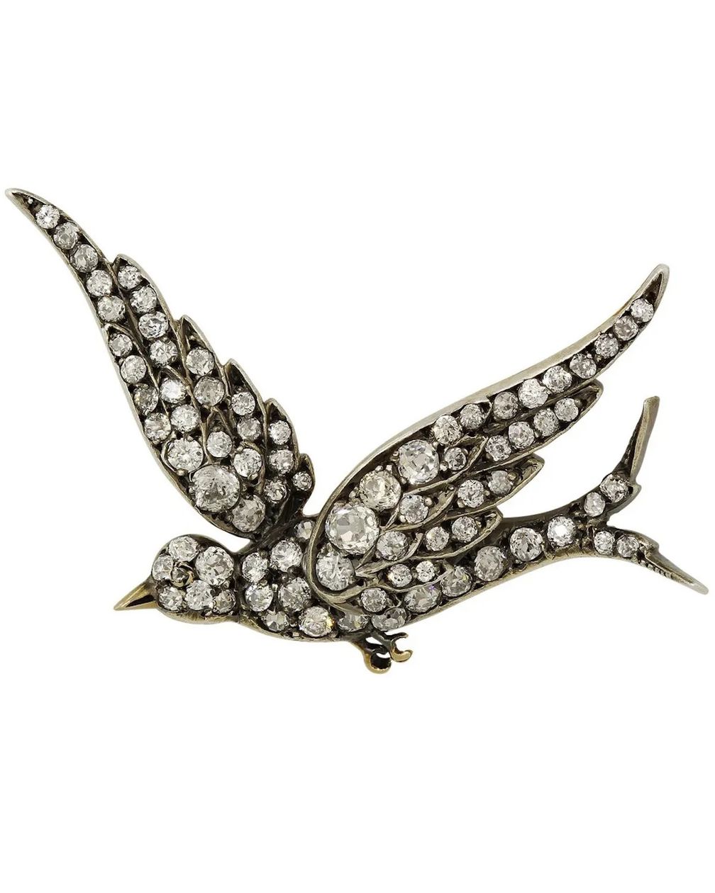 Антикварная викторианская бриллиантовая брошь-птица из серебра и золота: