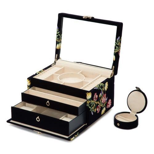 Эта бархатная шкатулка с цветочной вышивкой, оснащенная множеством вместительных отделений, прорезей для колец и ящичков, а также зеркалом, будет стильно хранить ваши драгоценности. Не говоря уже о том, что в комплект также входит подходящая миниатюрная коробочка для всех ваших дорожных нужд.