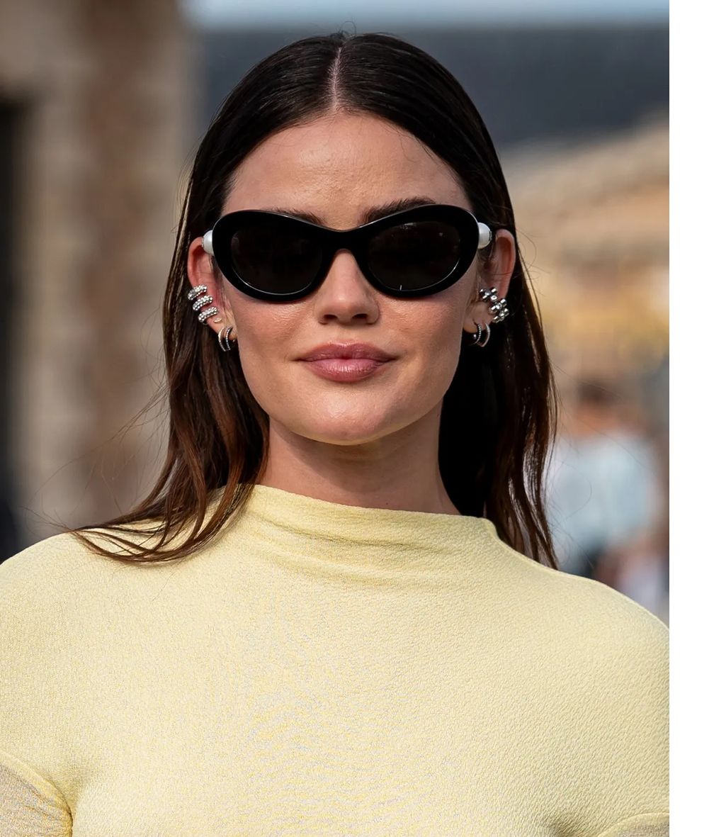 На показе Givenchy в Париже Люси Хейл выбрала эффектные бриллиантовые серьги. Стилист – Молли Диксон.