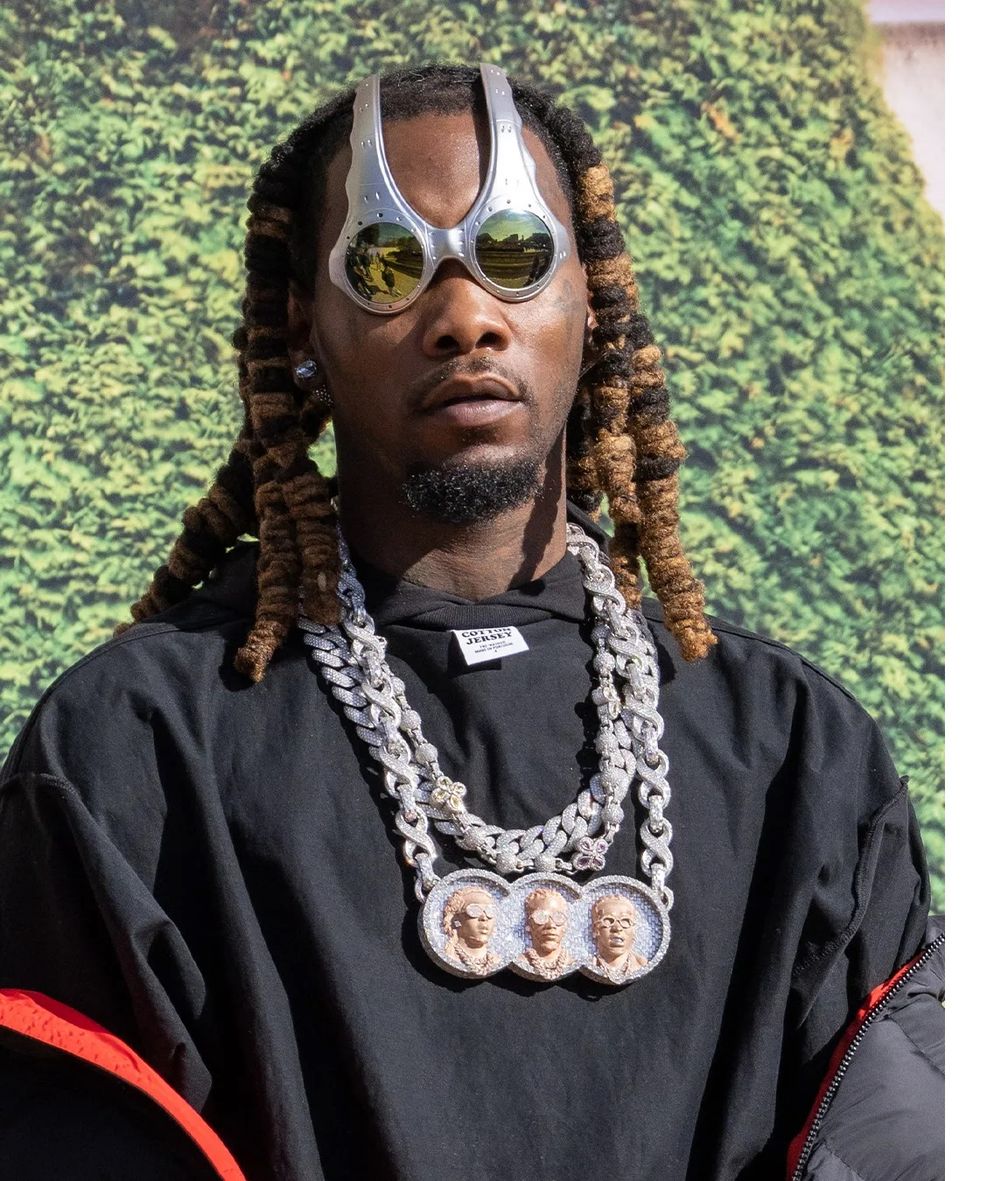 Рэпер надел свою фирменную цепь Migos среди других бриллиантовых цепей на показ Balenciaga в Париже.