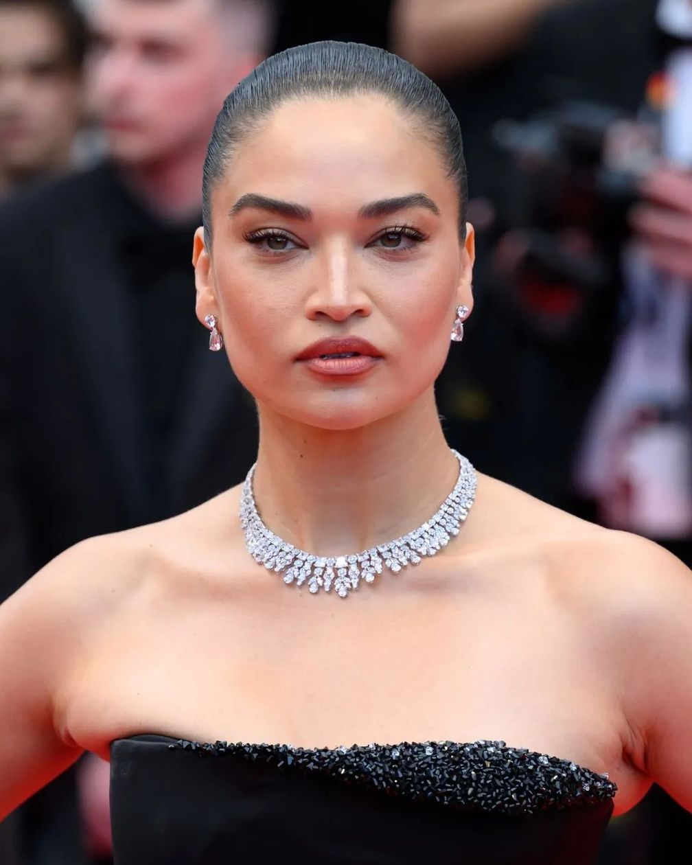 Модель Шанина Шейк надела украшения от бренда Hassanzadeh Jewelry на красную дорожку Каннского кинофестиваля 2025 года в Каннах, Франция.