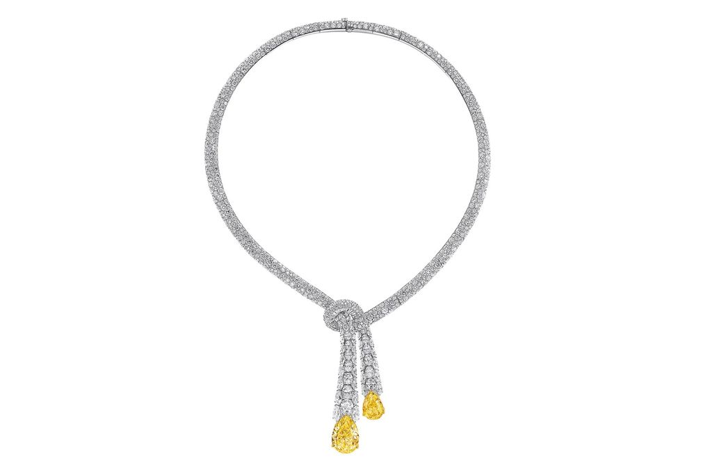 Колье с бриллиантами фантазийного насыщенно-желтого цвета и белыми бриллиантами, оправленными в желтое и белое золото: