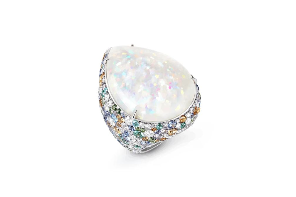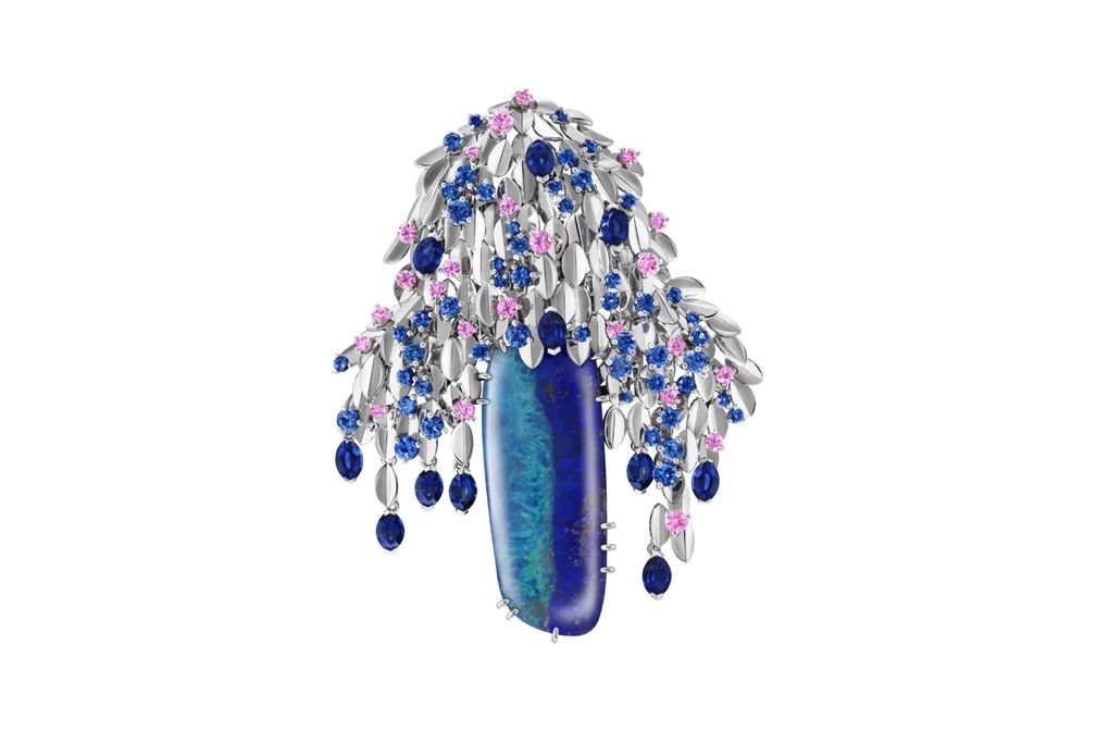 Брошь Feuillage Rêveur из белого золота с опалом весом 39,80 карата, голубыми и розовыми сапфирами: