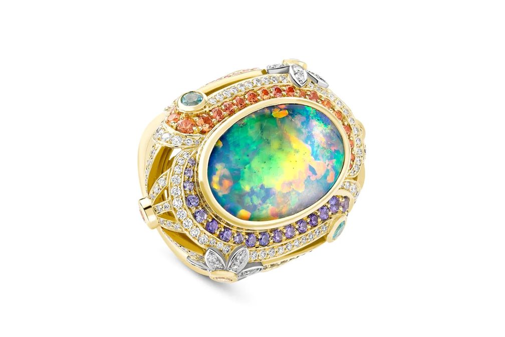 Кольцо Liverpool с овальным опалом, драгоценными камнями и бриллиантами из 18-каратного желтого золота: