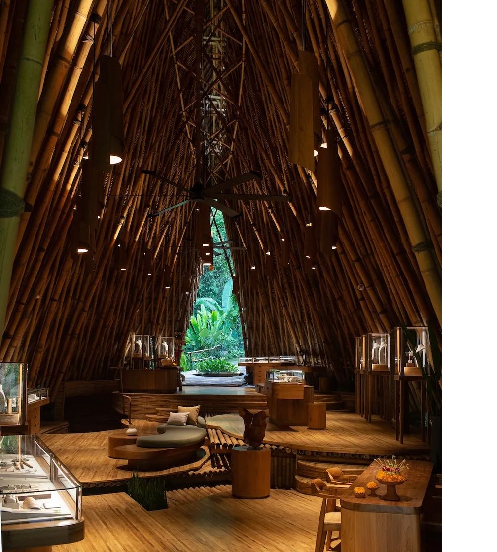 Возвышающийся бамбуковый магазин находится над священными ирригационными системами, которые не мешают работе фермы. Компания питает свои объекты, используя 100 % возобновляемой энергии, а 99 % отходов производства перерабатываются или утилизируются в рамках различных инициатив и партнерств.