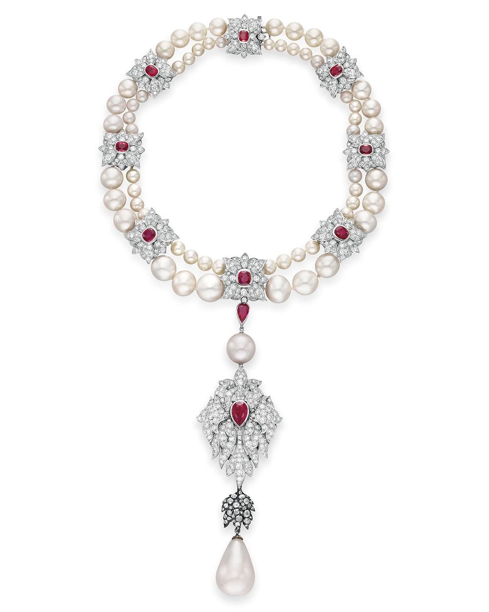Колье La Peregrina с жемчугом, бриллиантами и рубинами от Cartier (любезно предоставлено аукционным домом Christie’s):