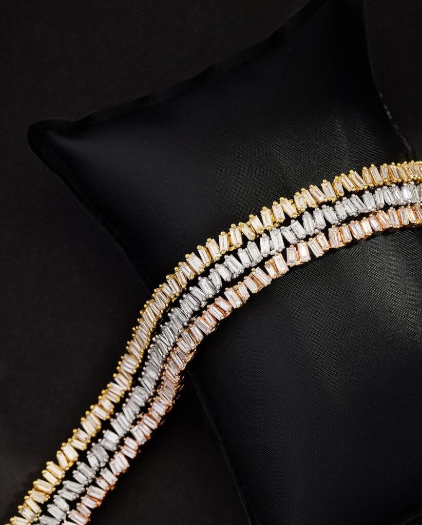 Непрерывная, гибкая нить бриллиантов — это определение инвестиционного украшения. Теннисный браслет ценится за свою плавность и подвижность и мягко облегает кисть. Дизайны от Suzanne Kalan — это вневременные теннисные браслеты из 18-каратного золота с бриллиантами багетной огранки, придающими им современный, сверкающий вид.