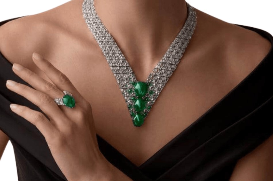 Грани кабошонов переплетаются в ажурные треугольные мотивы, инкрустированные бриллиантами и изумрудами. Соединенные крошечными металлическими кольцами, эти элементы создают очень гибкое ожерелье, удобное в носке.