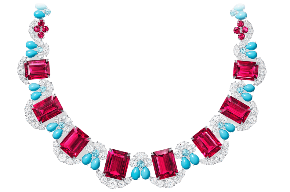 Колье Magic Escapes Amalfi – это мечта в голубых и розовато-красных тонах. Очаровательное колье представляет собой композицию из 47 рубеллитов. Украшенное бирюзой и бриллиантами, оно символизирует Амальфитанское побережье с его бугенвиллеями и прекрасным морем.