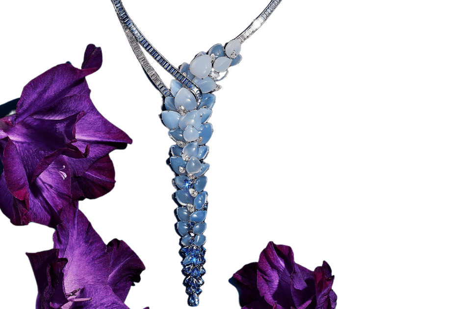 Дизайн напоминает о веточке глицинии, состоящей из 36 кусочков халцедона ручной работы, изготовленных на заказ. Элегантное украшение для глубокого декольте.
