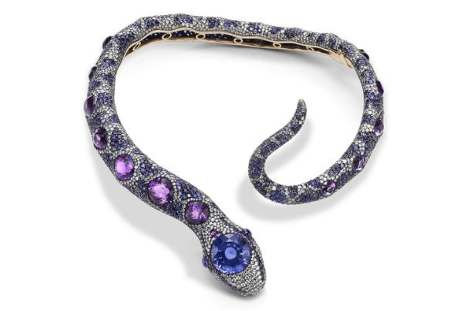 Мы выбрали для статьи красивое ожерелье в виде змеи. Колье с сапфирами, бриллиантами и аметистами выполнено в виде оправленной в бриллианты pavé и сапфиры змеи из серебра и 18-каратного золота.