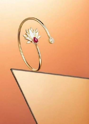 Браслет Golden Petal от ANTY представляет собой элегантный перламутровый лотос, украшенный рубином каплевидной формы и бриллиантами на одном конце, а другой конец украшен бриллиантовым узором: