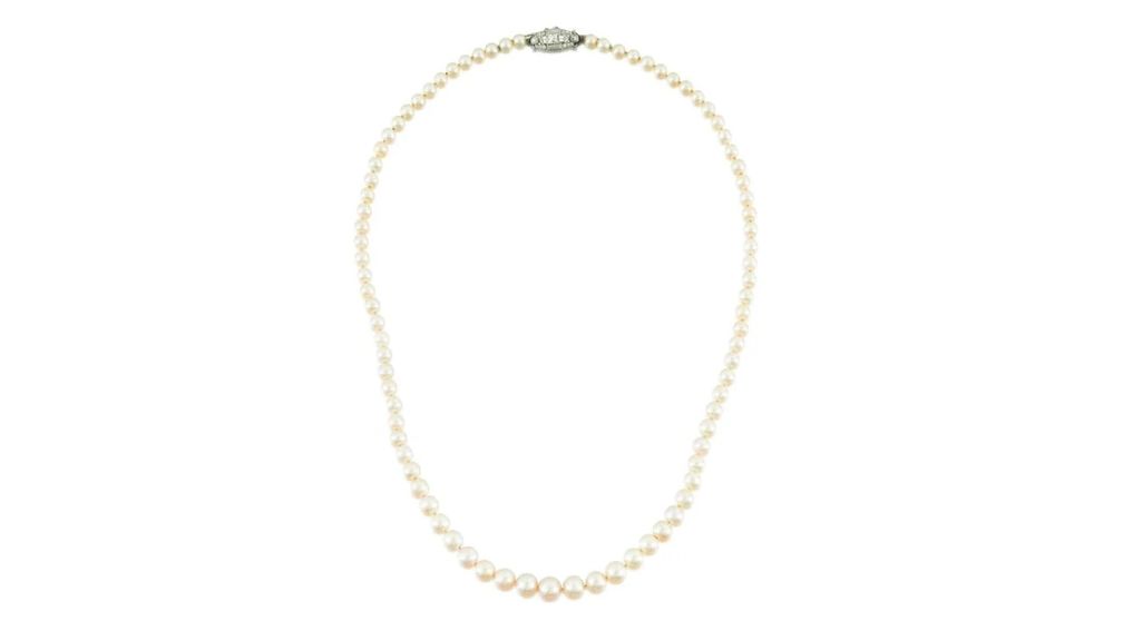 Колье с 83 округлыми жемчужинами кремового цвета и бриллиантовой застежкой.