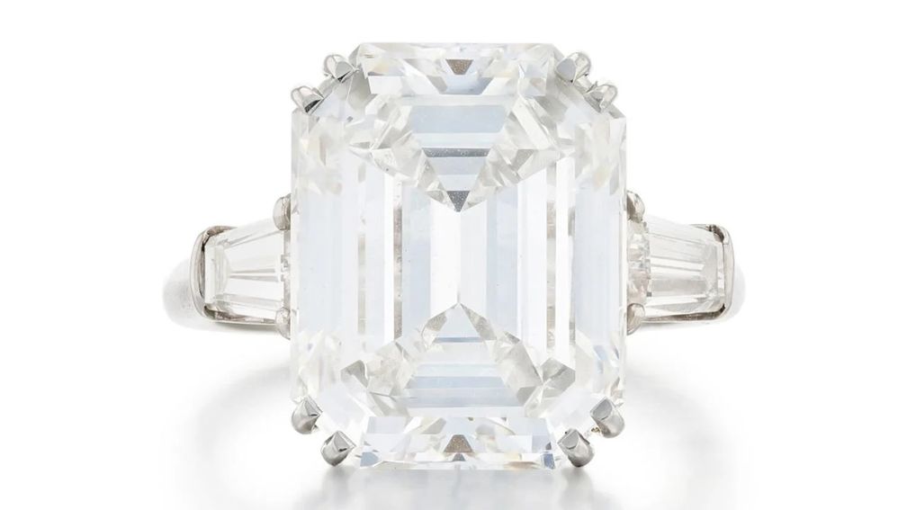 Это кольцо от Harry Winston украшено бриллиантом огранки багет, весом 7,83 карата, цвета E, чистоты VS1.