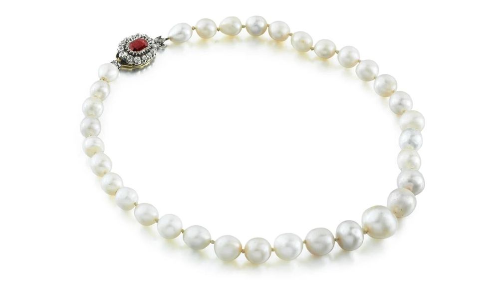 Колье из 33 округлых, овальных, пуговичных и каплевидных природных жемчужин с застежкой из восьмиугольного граната-родолита и бриллиантов круглой огранки.