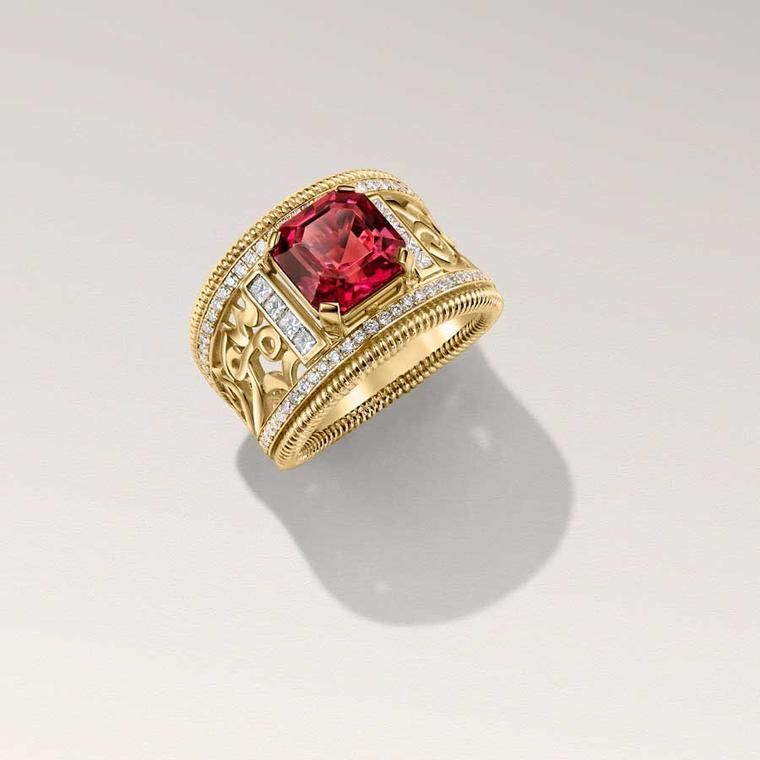 Для создания замысловатого узора на кольце Art Deco Calligraphy от Azza Fahmy, украшенном рубеллитом весом 3,6 карата, была использована ручная работа: