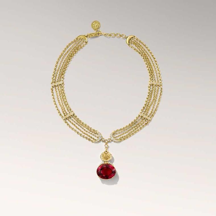 Ярко-красный рубеллит является центральным элементом ожерелья Chains of Happiness, украшенного бриллиантами и несущего секретное послание арабской вязью – «счастье»: