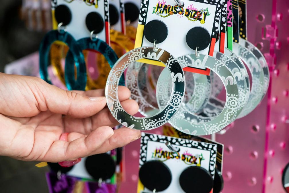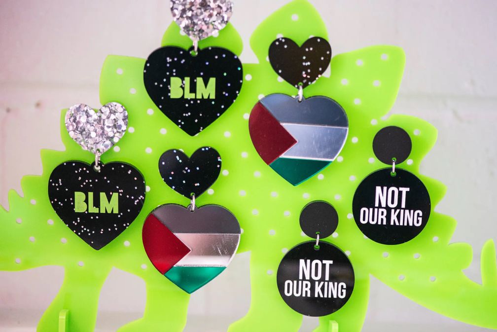 Этот подход отражает ее бренд бижутерии и аксессуаров Haus of Dizzy. Акриловые серьги из коллекции бренда Social Justice украшены надписями типа Stop Violence Against Women («Остановим насилие в отношении женщин»). На булавках с яркими блестящими сердечками изображены черный, красный и желтый цвета флага аборигенов Австралии – сочетание, которое также можно найти на эластичных ремнях бренда и шармах для обуви.
