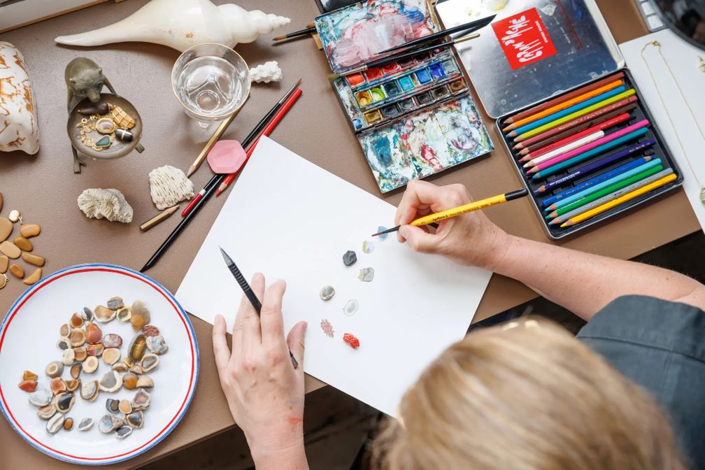 На кухне своего дома-студии в лондонском пригороде Уимблдон Матулен открыла несколько ящиков с материалами, которые она использует в своих украшениях: линзы маяка из Дандженесса, Англия, которые были выброшены и превратились в морское стекло; и камни с пляжа недалеко от Биаррица, Франция, которые «выглядят как карамель», по ее словам.