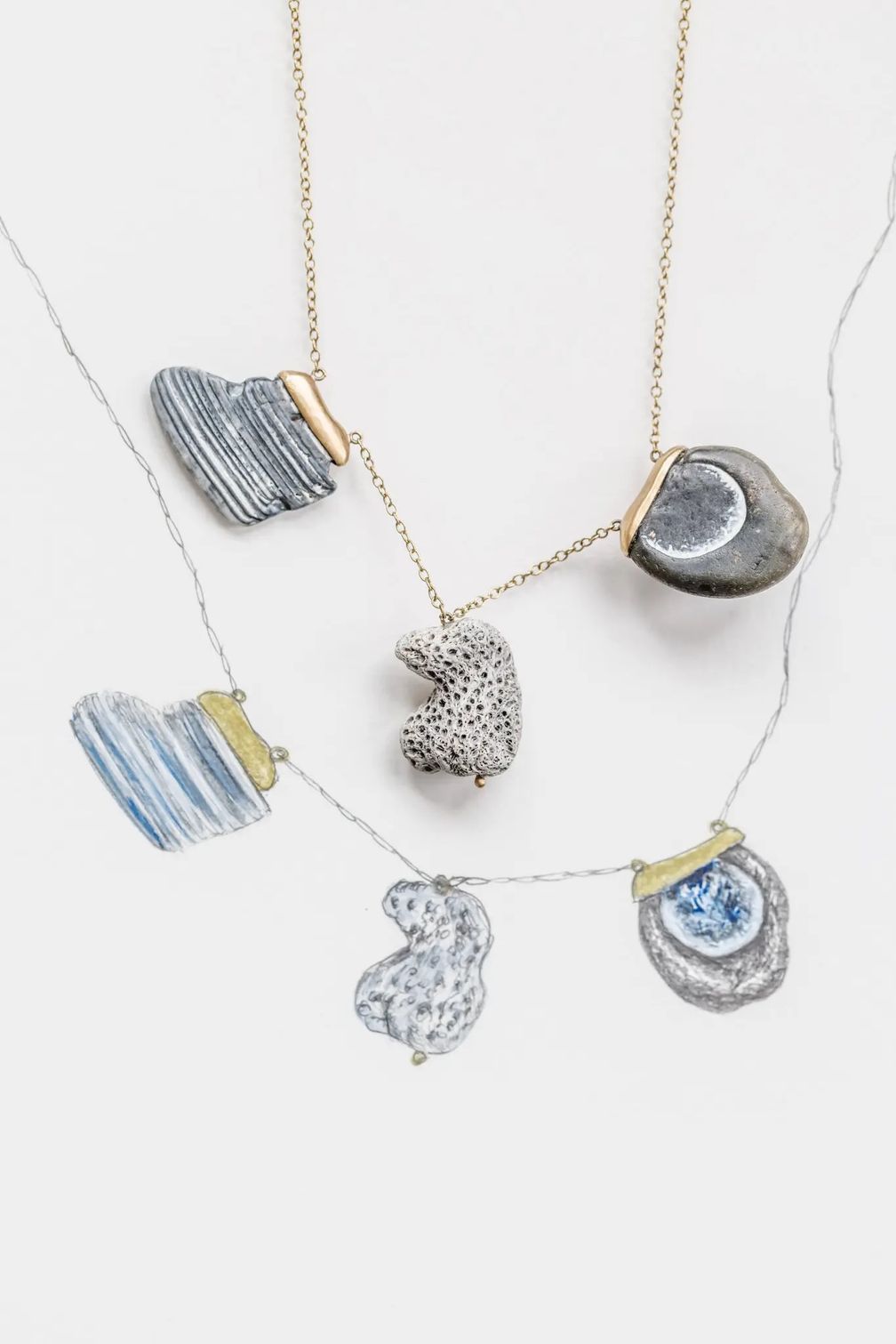 Эскиз ожерелья, созданного Матулен, в сочетании с готовым изделием (Jeremie Souteyrat for The New York Times):