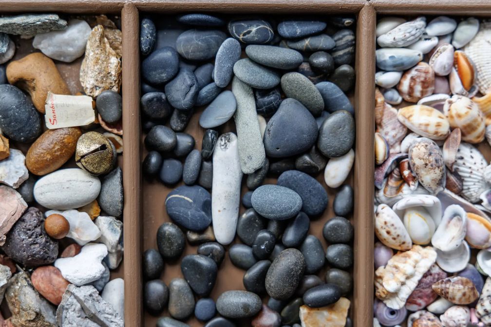Ракушки и камни в ящике в ателье Натали Матулен, французского дизайнера ювелирных изделий, которая живет и работает в пригороде Лондона, Уимблдоне: