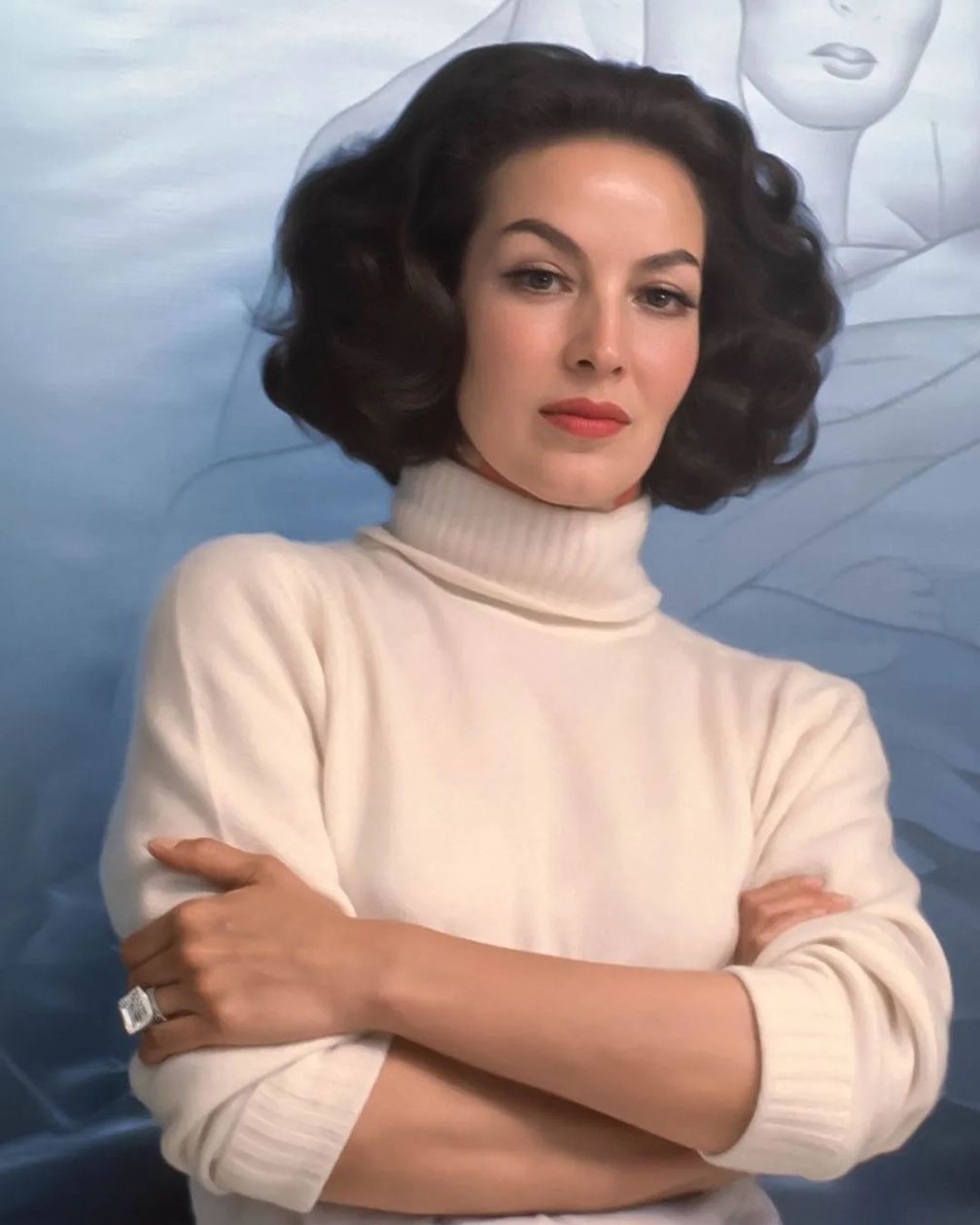 Мексиканская актриса Мария Феликс позирует с портретом Диего Риверы, на ней оригинальный бриллиант Ашока весом 41,37 карата: