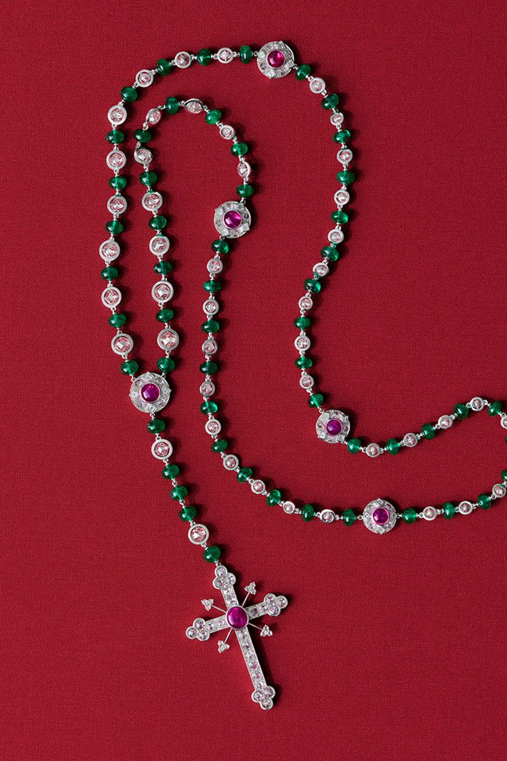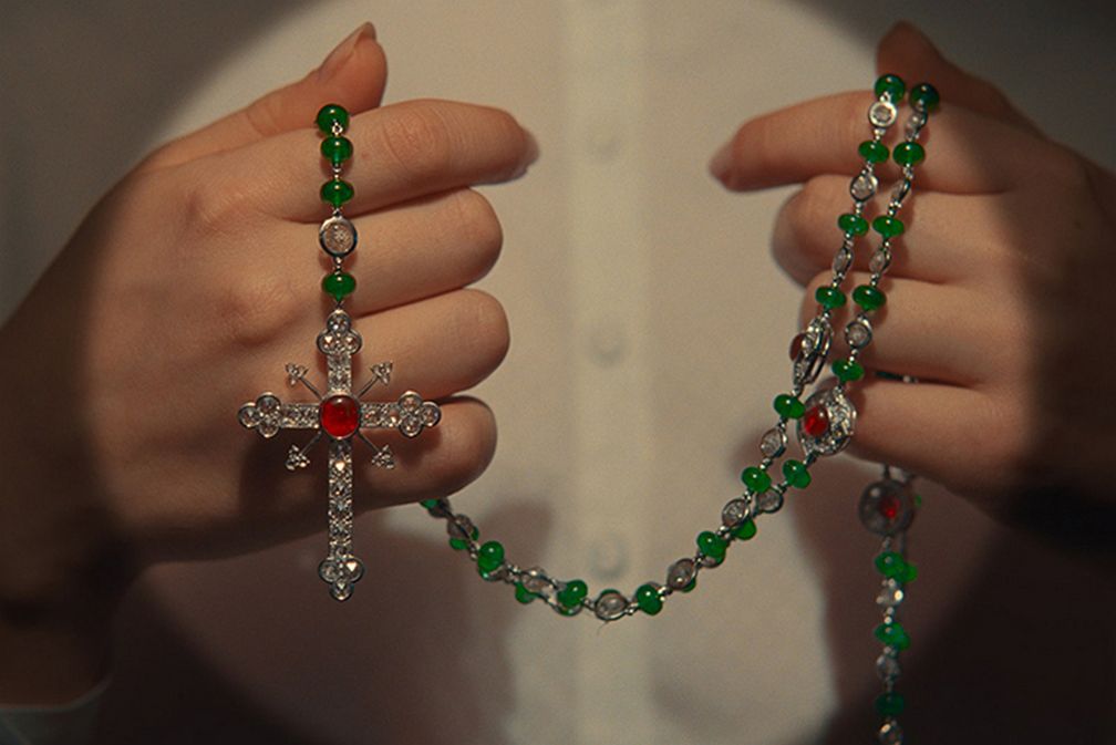Дизайнеры Cartier решили включить в ожерелье камни огранки роза, поскольку посчитали, что это соответствует видению Андерсона и его склонности к эстетике, вдохновленной винтажным стилем. Бриллианты огранки роза, призванные сверкать при свете свечей, достигли пика популярности в викторианскую эпоху. Конечно, было бы необычно увидеть монахиню с таким роскошным украшением в нашем мире, но эти четки прекрасно вписываются в созданную Уэсом Андерсоном вселенную.