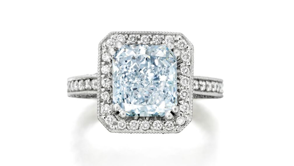 Кольцо с фантазийным светло-голубым бриллиантом огранки кушон, весом 3,01 карата и чистотой VS1 будет продано Bonhams за $ 200 000 — $ 300 000.
