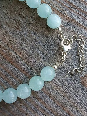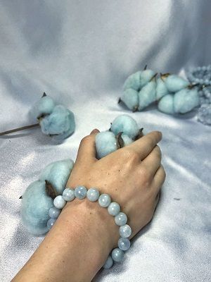 У аквамарина очень мягкий окрас: чистый оттенок прохладного голубого, сине-голубой, голубой с зеленым отливом, бледный бирюзовый. Браслеты изготавливают как с прозрачными образцами, так и с полупрозрачными и непрозрачными – они все одинаково красивы, имеют выраженный стеклянный блеск.