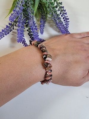 В браслетах родонит в полной мере раскрывает свою красоту. Ювелирные салоны предоставляют широкий ассортимент изделий из этого камня, но чаще всего в продаже встречаются следующие модели: