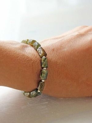 - Браслет, нанизанный на нитку, леску или резинку. Минималистичный дизайн привлекает к себе внимание за счет того, что легко сочетается со многими стилями в одежде: от кэжуал до строгого офисного дресс-кода. Возможность самостоятельной сборки придает такому варианту дополнительную популярность, так как можно выбрать не только бусины по душе, но дополнительные металлические или деревянные вставки. Также встречаются и такие варианты, в которых везувианит сочетается с другими минералами. Чаще всего это александрит, малахит, топаз, турмалин, агат, хризоберилл, авантюрин и нефрит. Состоять аксессуар может как из одной, так и из нескольких ниток с бусинами. Они могут быть независимы друг от друга или же переплетены (скреплены) в основании застежки. Такие браслетики хорошо смотрятся с летними платьями, сарафанами, туниками. В качестве компаньона можно выбрать идентичный камень в подвеске или серьгах.