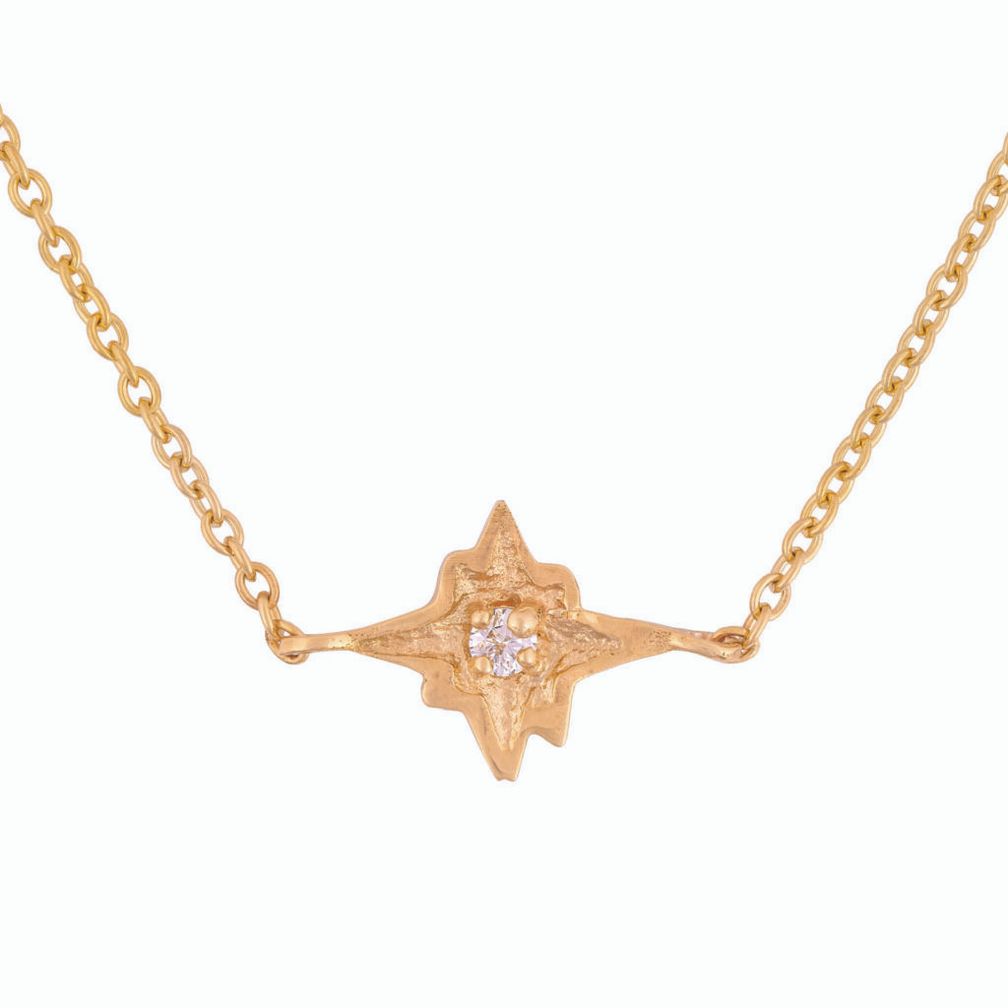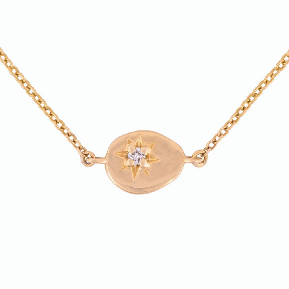 Одна из самых ярких звезд ночного неба запечатлена в виде сверкающего классического бриллианта в текстурированном диске на цепочке из переработанного золота 14 карат.