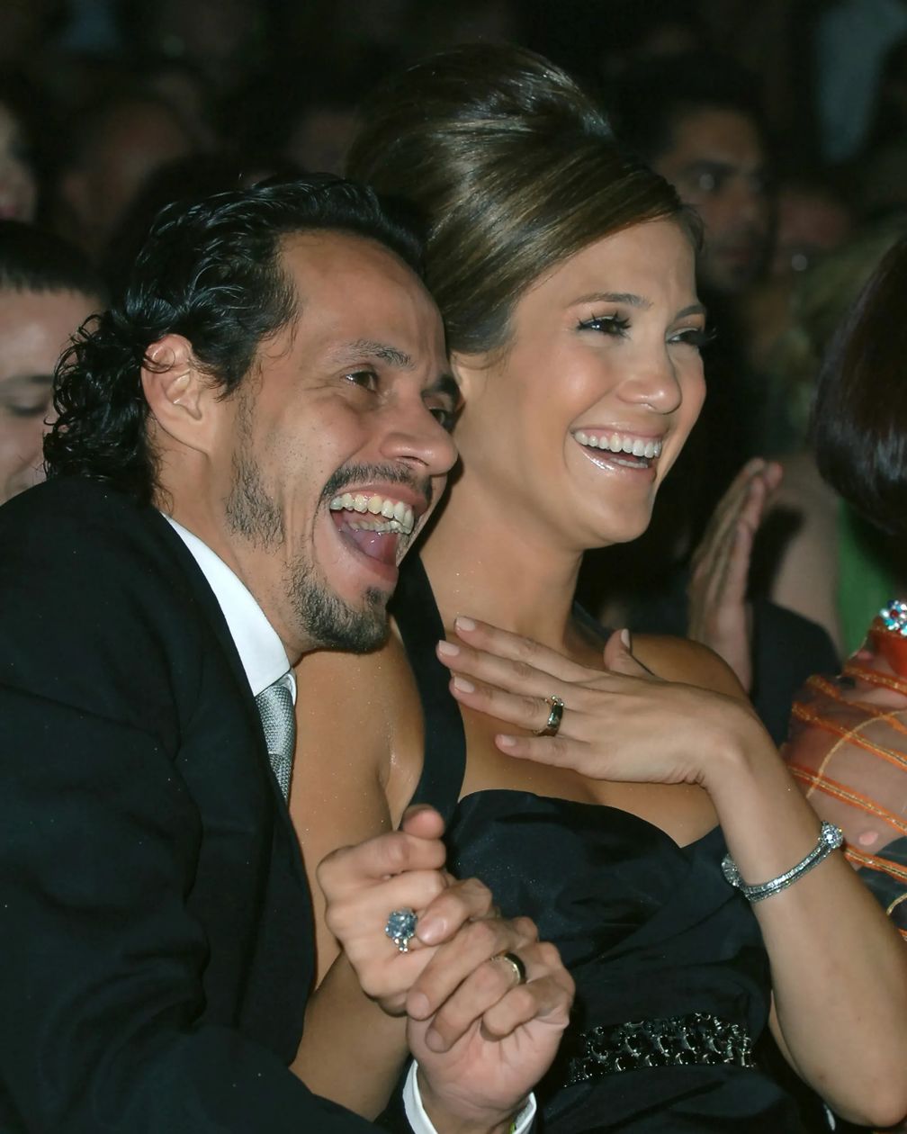 Марк Энтони и Дженнифер Лопес на фото в 2005 году, на руке Лопес помолвочное кольцо с голубым бриллиантом от Harry Winston (Getty Images):
