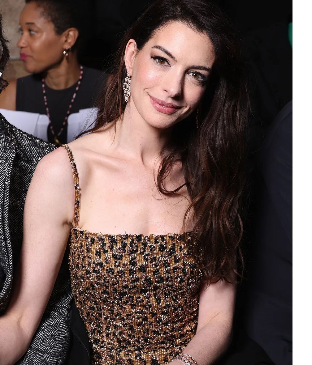 Хэтэуэй посетила показ Valentino весна-лето 2023 Haute Couture в леопардовом образе с ног до головы. Будучи амбассадором Bulgari, Хэтэуэй надела серьги-люстры и ослепительный ассортимент браслетов и колец от этого бренда. Она выбрала мини-платье с леопардовым принтом, украшенное блестками, колготки со звериным принтом и туфли с леопардовым принтом (стилист Эрин Уолш).