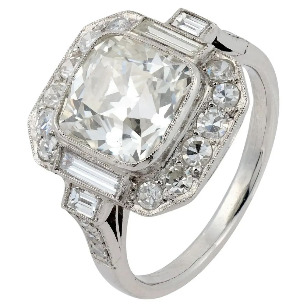 Платиновое помолвочное кольцо с бриллиантом старой шахтной огранки, окруженным двадцатью двумя бриллиантами одинарной огранки и огранки багет, от 1stDibs: