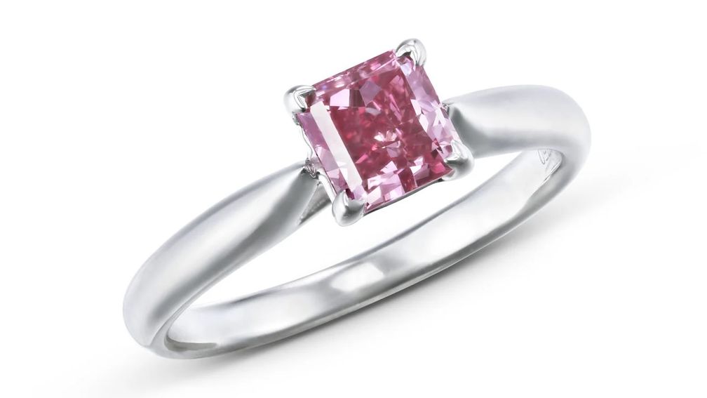 Это кольцо украшено квадратным бриллиантом весом 0,86 карата, фантазийного ярко-пурпурно-розового цвета, чистоты SI2. Его предварительная максимальная оценка составляет 1,5 млн гонконгских долларов ($ 192 729).