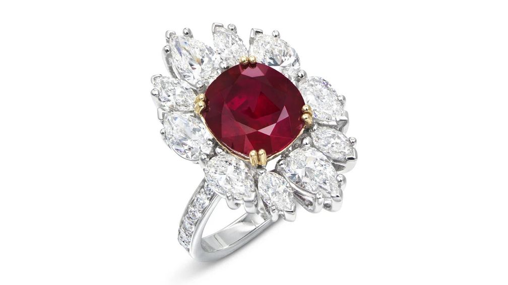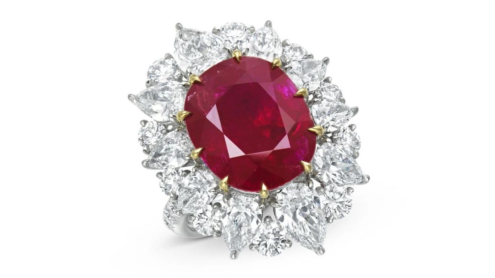 Еще одно кольцо с рубином, на этот раз с бирманским камнем овальной огранки, весом 12,78 карата в оправе с грушевидными и круглыми белыми бриллиантами, оценено в 1,2 млн гонконгских долларов ($ 154 182).